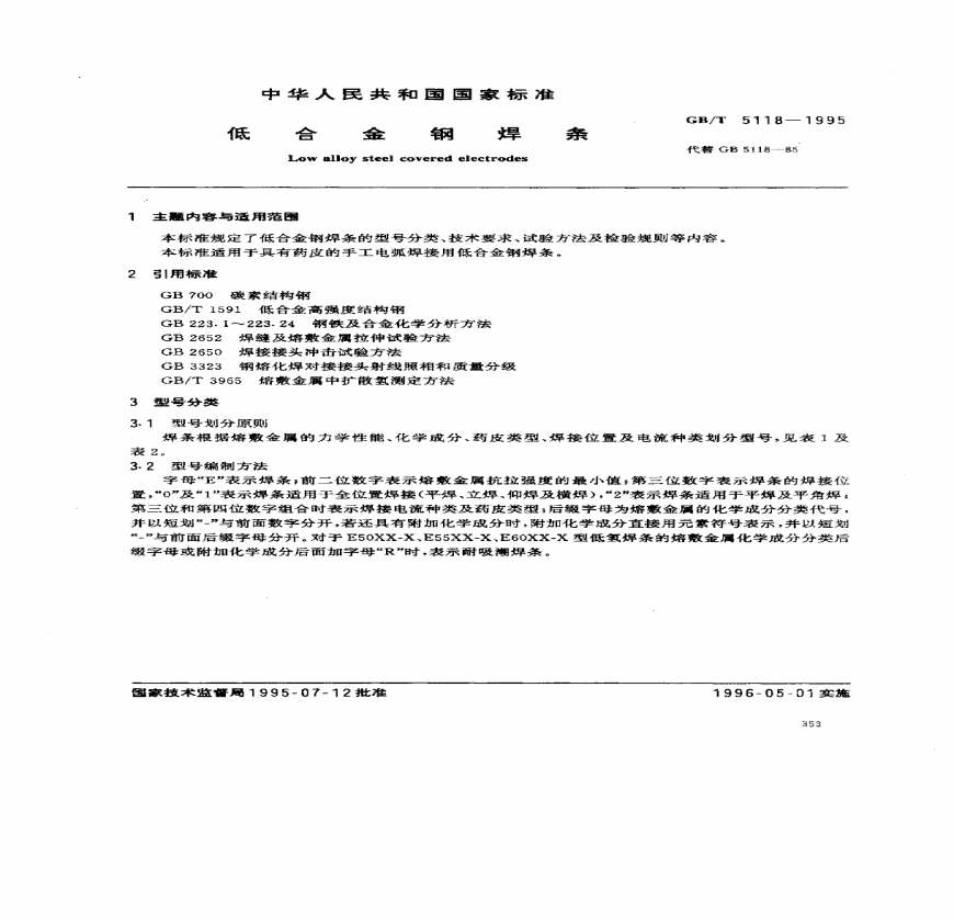 国家标准(GB)本标准规定了低合金钢焊条的型号分类、技术要求、试验方法及检验规则等内容。