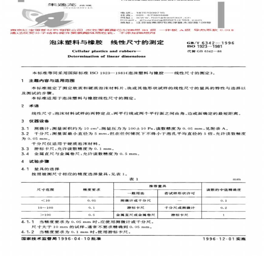> GB-T_6342-1996_泡沫塑料与橡胶线性尺寸测定