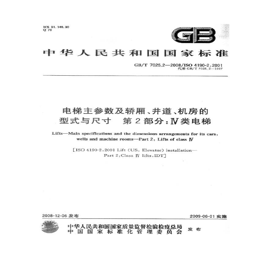> GBT 7025.2-2008 电梯主参数及轿厢、井道、机房型式与尺寸 第1部