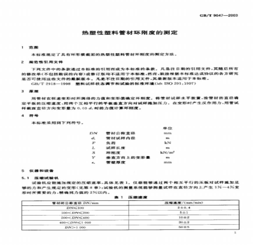 热塑性塑料管材环刚度的测定(完整) 阅读可下载 热塑性塑料管材环刚度的测定 前言本标准等同采用 ISO ;《热塑性塑料管材环刚度的测定》,技术内容上完全等同,仅在文字上进行了编辑性修改,编写方法完全对应。