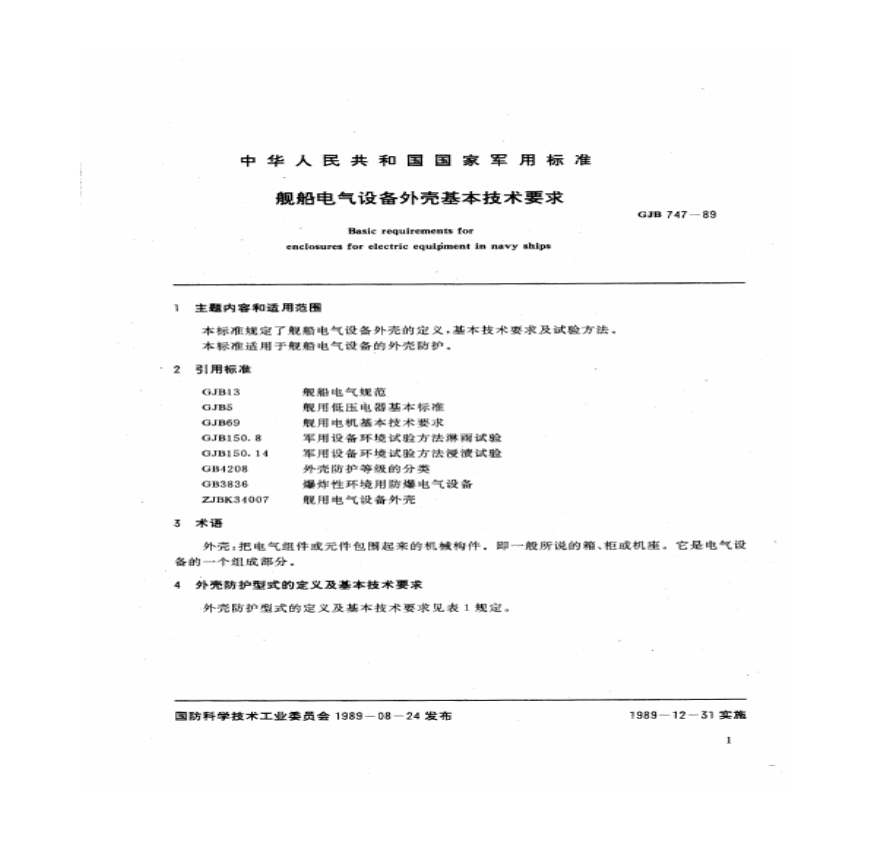 > GJB 747-1989_舰船电气设备外壳基本技术要求