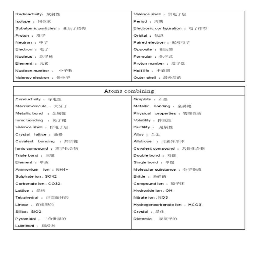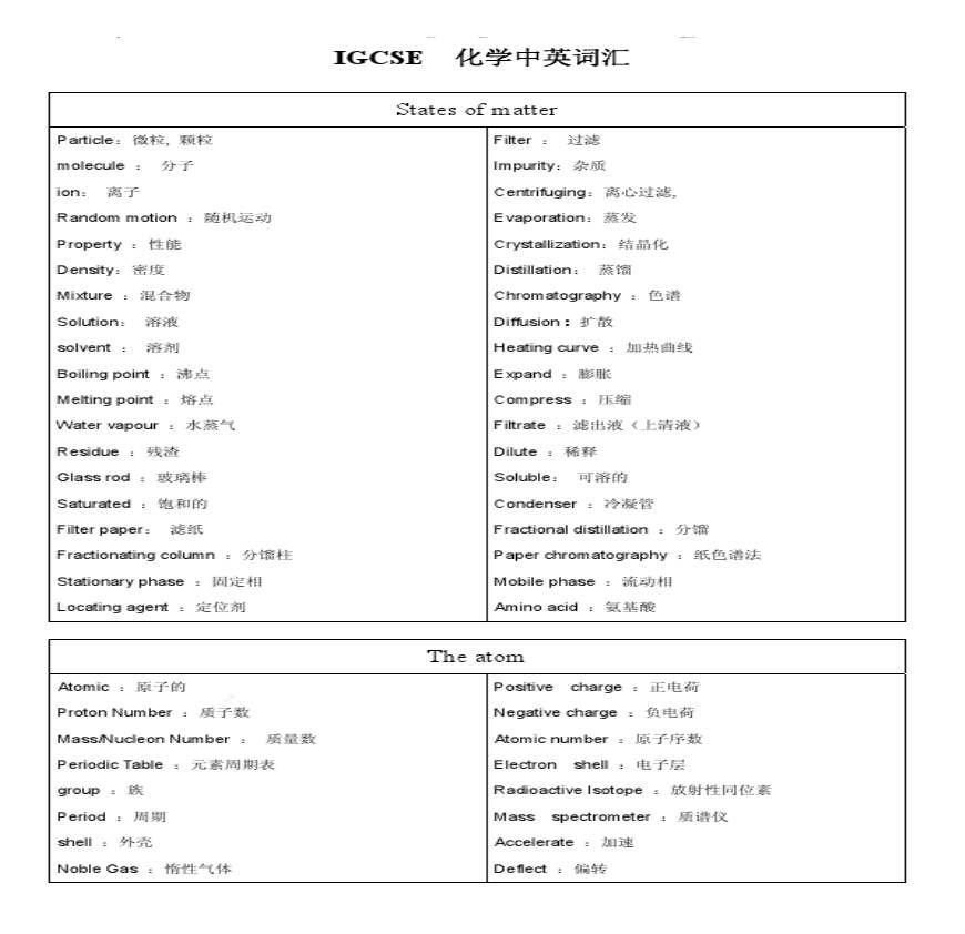 IGCSE化学中英词汇资料下载,喜欢的朋友可以下载收藏!