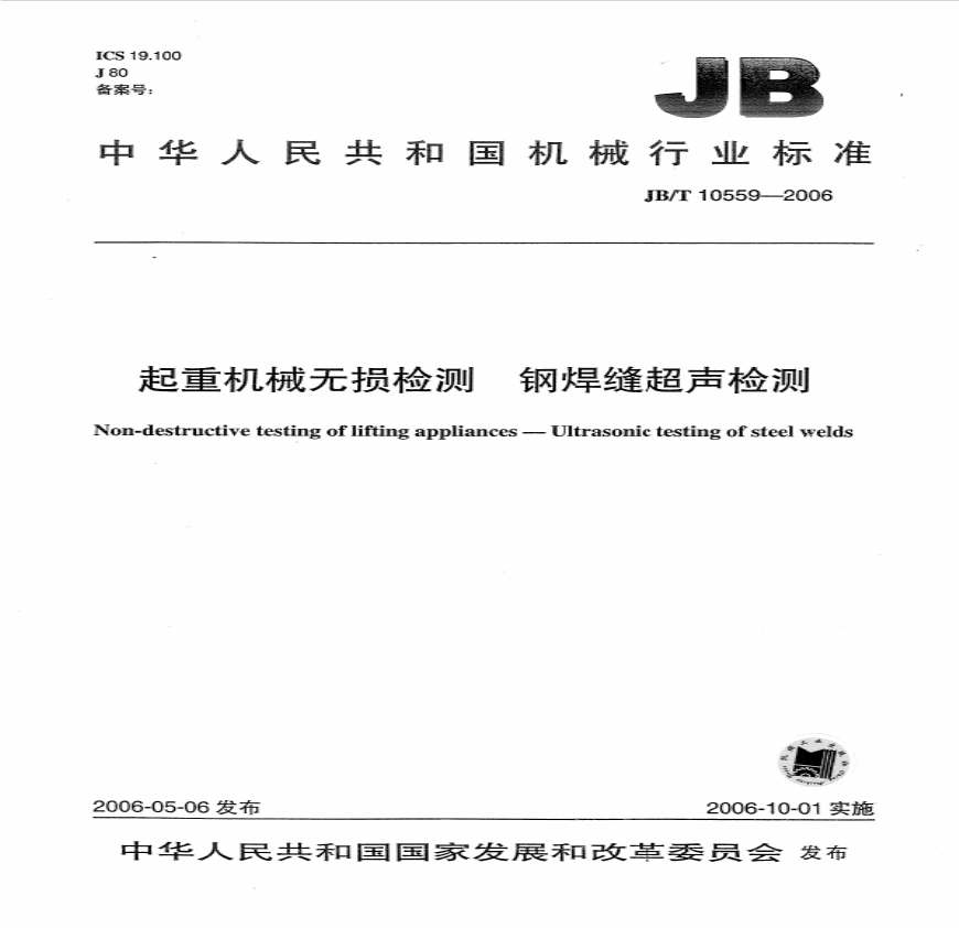 JB 10559-2006-T 起重机械无损检测 钢焊缝超声检测资料下载,喜欢的朋友可以下载收藏!