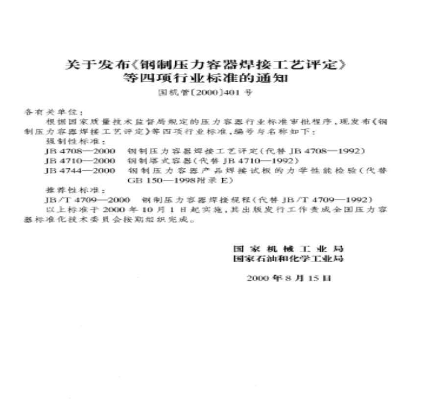 JB 4709-2000 钢制压力容器焊接规程资料下载,喜欢的朋友可以下载收藏!