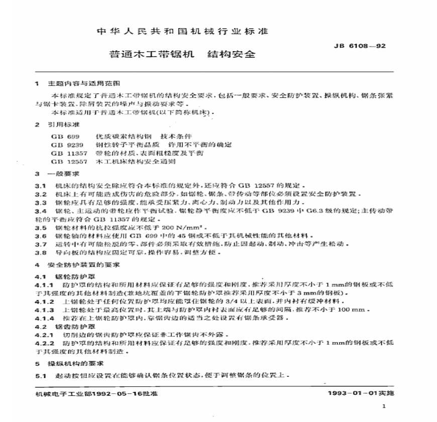 > JB6108-1992 普通木工带锯机 结构安全
