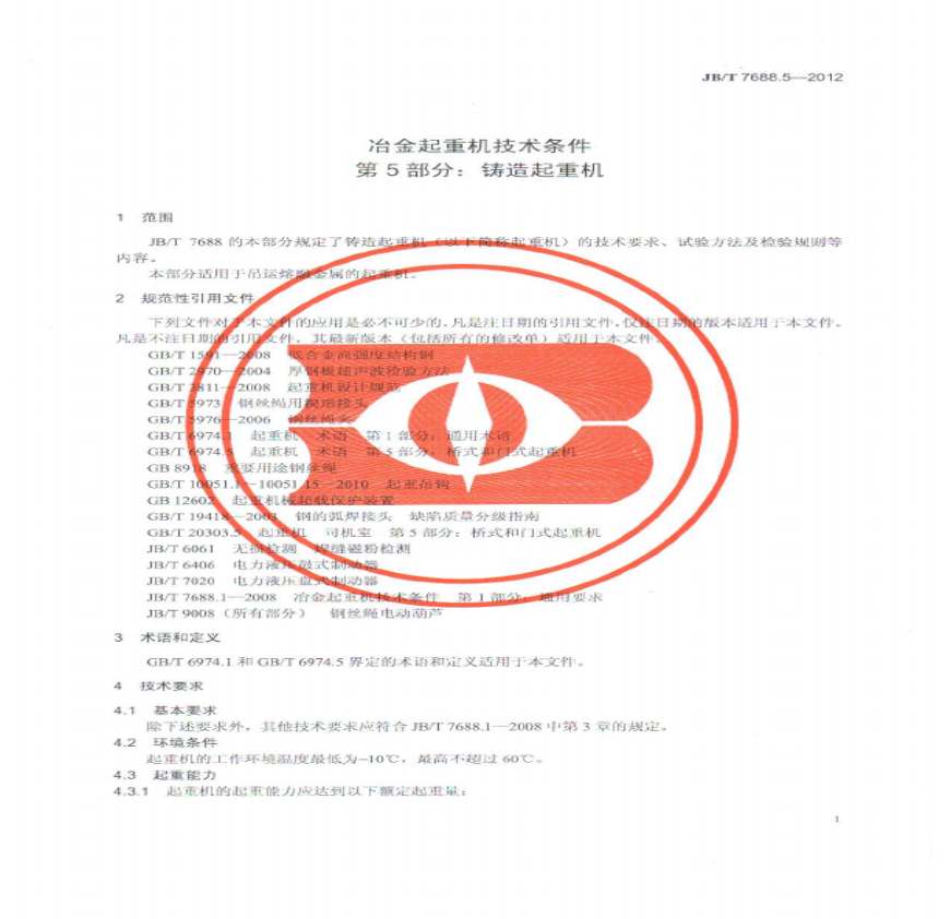 JB7688.5-2012T 冶金起重机技术条件 第5部分:铸造起重机资料下载,喜欢的朋友可以下载收藏!