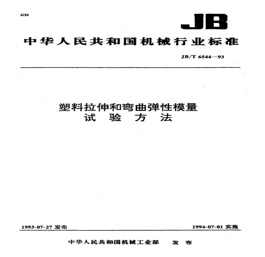 > JB/T 6544-1993 塑料拉伸和弯曲弹性模量 试验方法