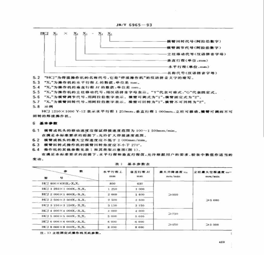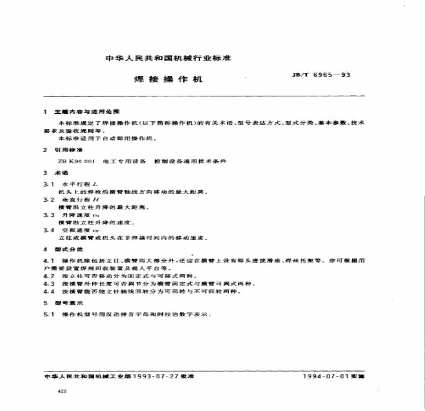 机械行业标准(JB)本标准规定了焊接操作机的有关术语、型式表达方式、型式分类、基本参数、技术要求及验收规则等。