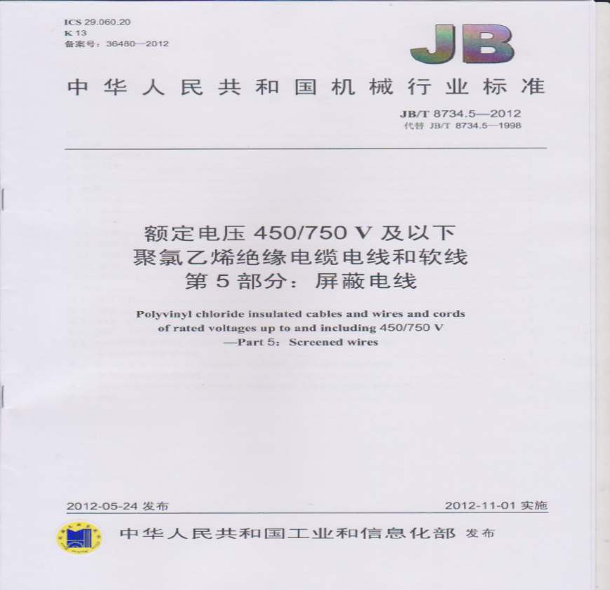> JBT 8734.5-2012 额定电压450-750V及以下聚氯乙烯绝缘电缆电线和
