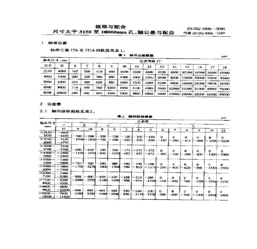 JBZQ 4006-2006 极限与配合尺寸大于3150至10000mm孔、轴公差与配合资料下载,喜欢的朋友可以下载收藏!