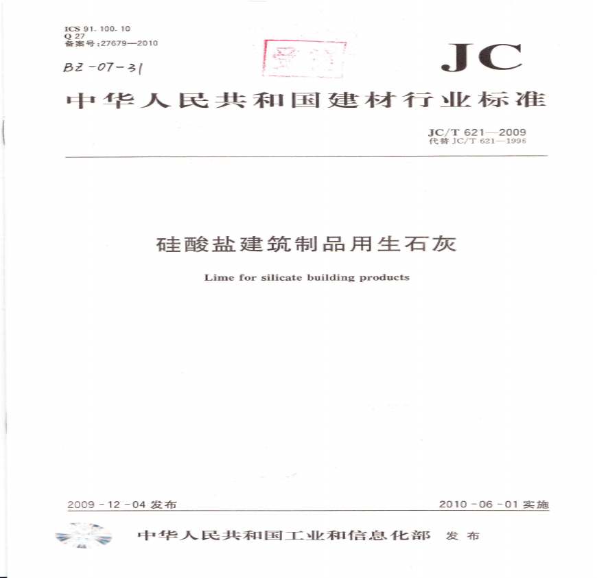> JC T621-2009硅酸盐建筑制品用生石灰