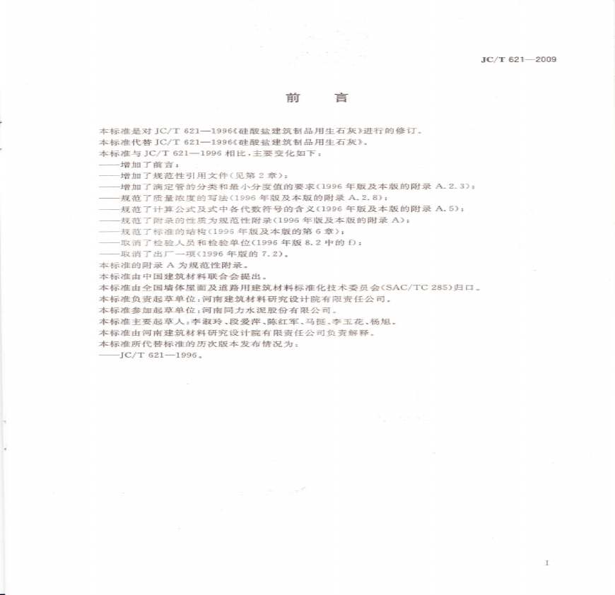 JC T621-2009硅酸盐建筑制品用生石灰.pdf 免费下载