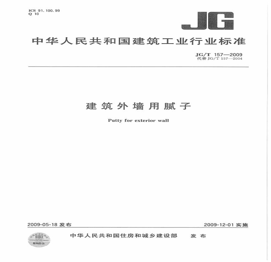 JG-T 157-2009 建筑外墙用腻子资料下载,喜欢的朋友可以下载收藏!