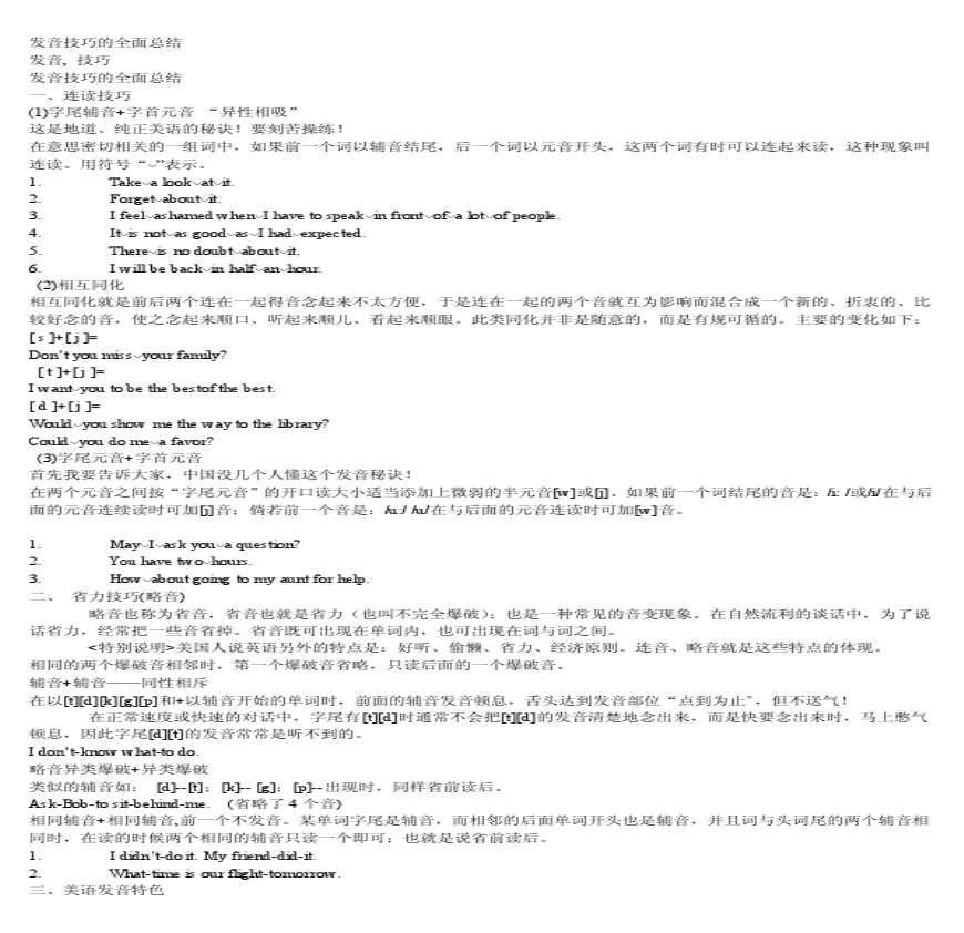 学习资料页 的发音的一、连读技巧字尾辅音+字首元音“ 特别说明 美国人说另外的特点是:好听、偷懒、省力、经济原则。