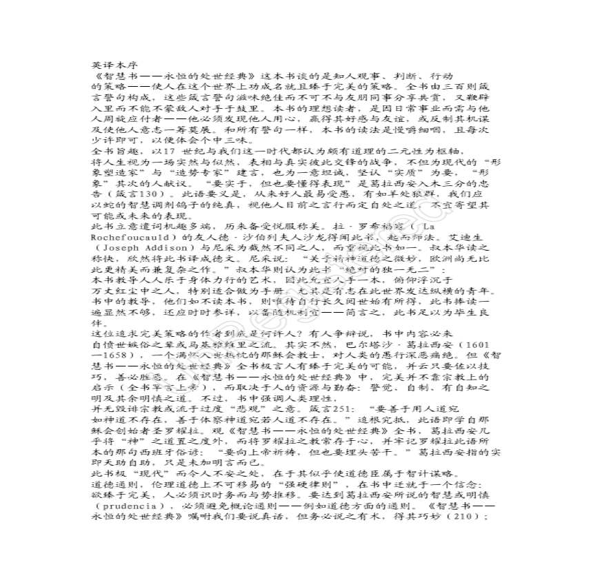 译者: 作者: 巴尔塔沙·葛拉西安 年: 学习资料页 智慧书》序言[打印本页]英译本序《智慧书永恒的处世经典》这本书谈的是知人观事、判断、行动的策略使人在这个世界上功成名就且臻于完美的策略。