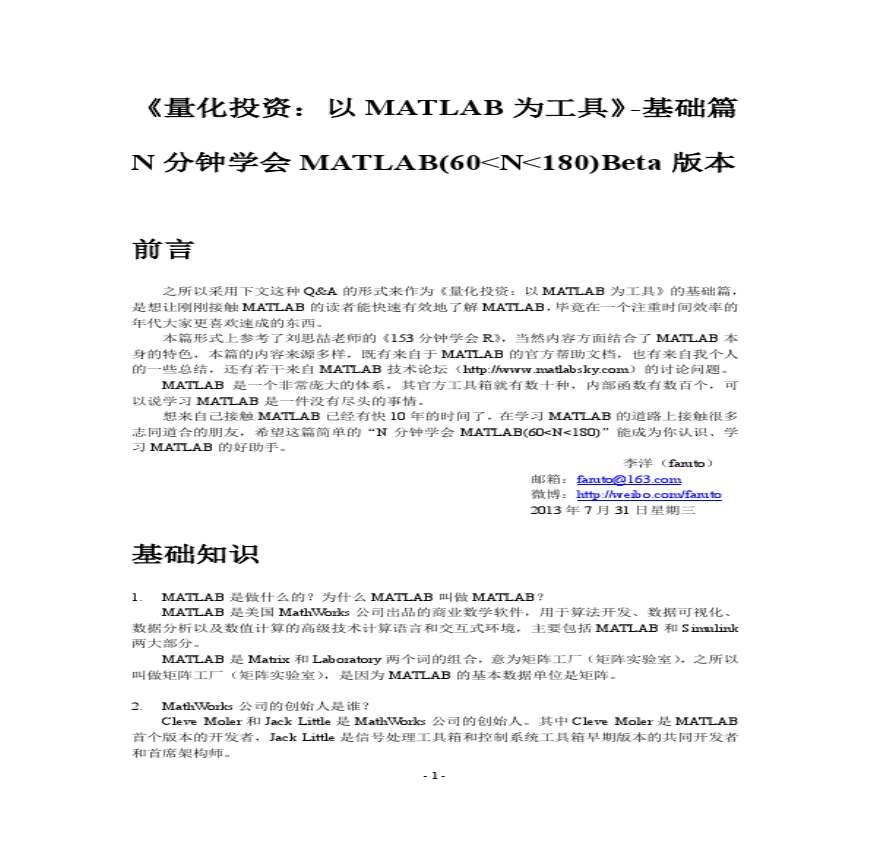 N分钟学会MATLAB(N大于60N小于180)-Beta版本(《量化投资:以MATL.pdf 免费下载