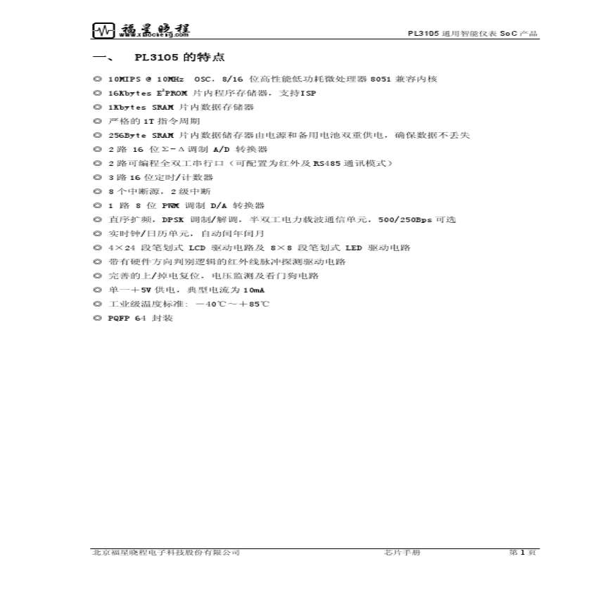版本:文件序号:日期:北京福星晓程电子科技股份有限公司PL的特点MIPSMHOSC位高性能低功耗微处理器