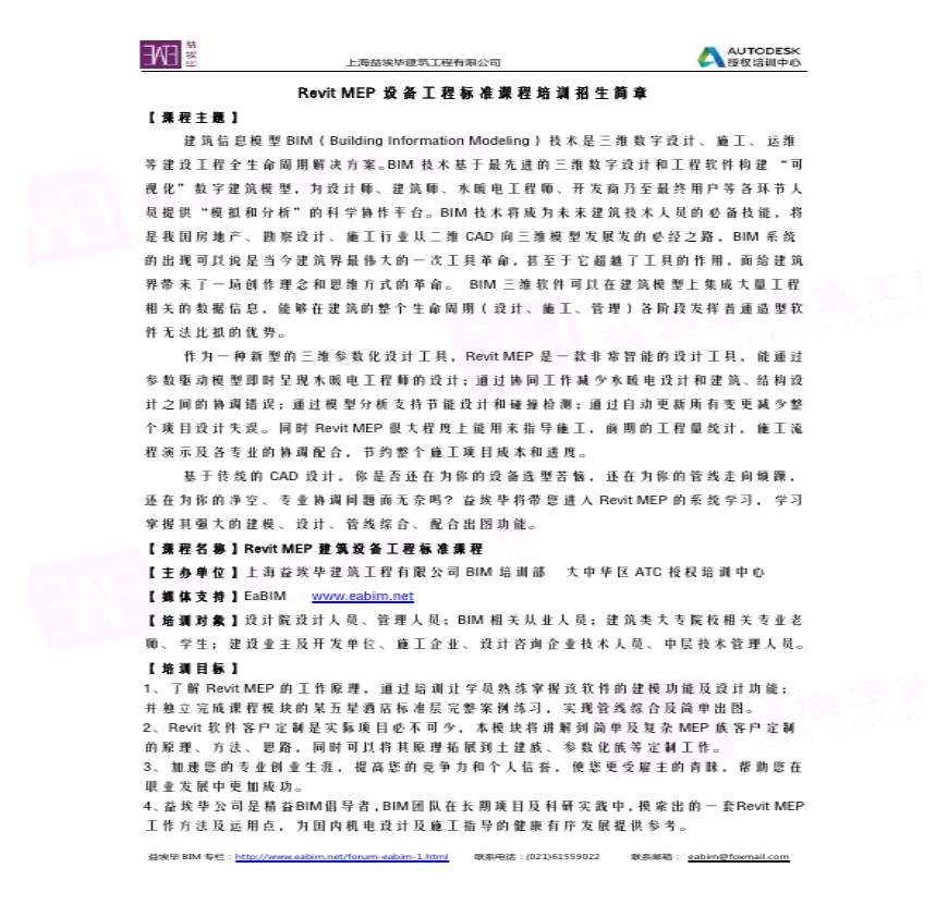 、E生态建筑大师标准课程 E生态建筑大师标准课程招生简章 V 、Nr建筑整合运用标准课程 N建筑设计_ 学习资料页 采用整体设计理念,从整座建筑物的角度来处理信息,将给排水、暖通和电气系统与建筑模型关联起来。