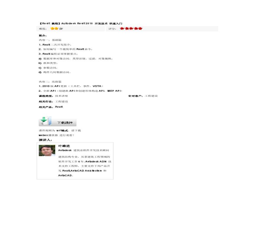 【Revit 教程】Autodesk Revit 2010 开发技术 快速入门资料下载,喜欢的朋友可以下载收藏!