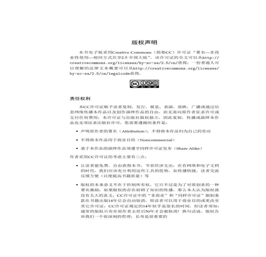 年版权声明本书电子版采用CrC(简称CC)许可证“署名—非商业性使用—相同方式共享中国大陆”,该许可证的全文可以从获得