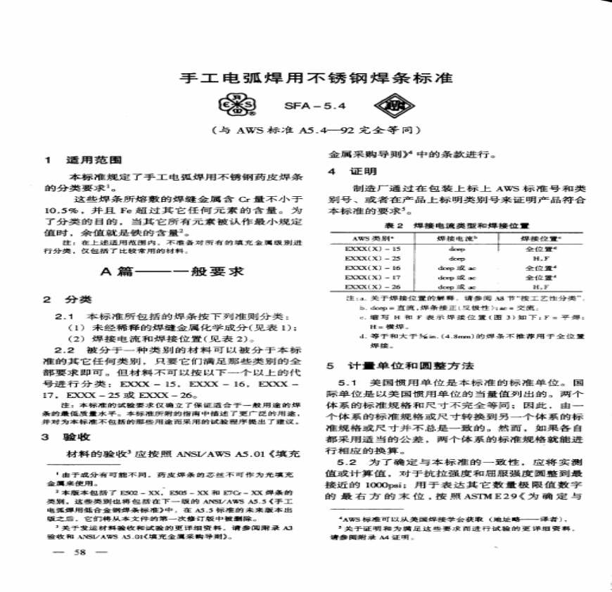 > SFA-5.4手工电弧焊用不锈钢焊条标准