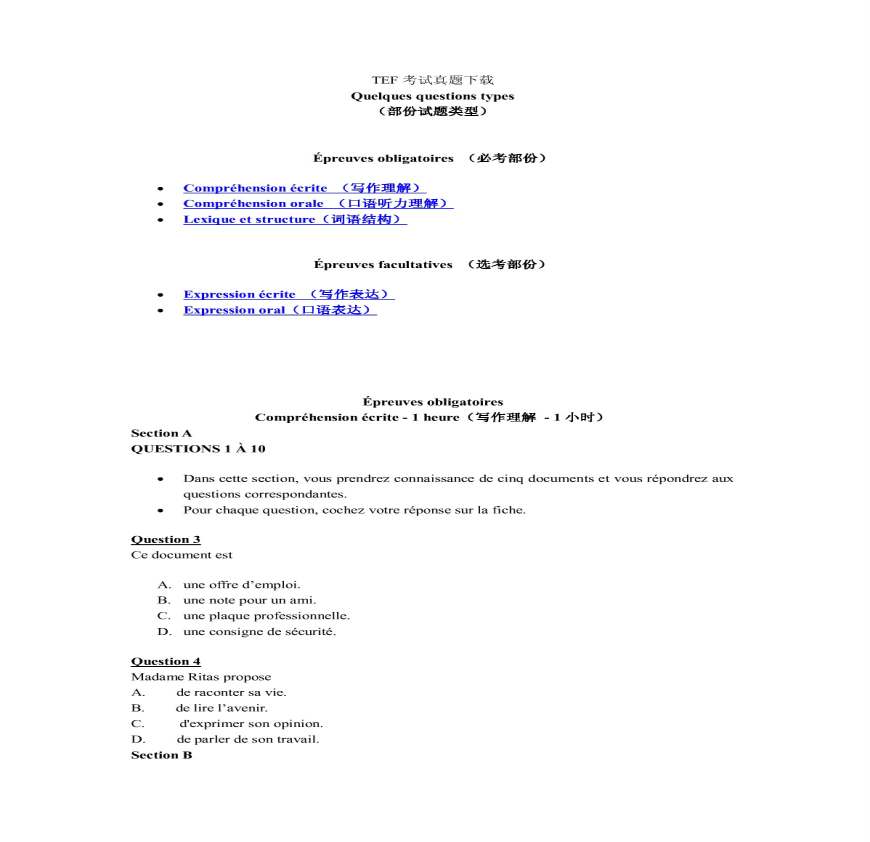 TEF考试真题资料下载,喜欢的朋友可以下载收藏!