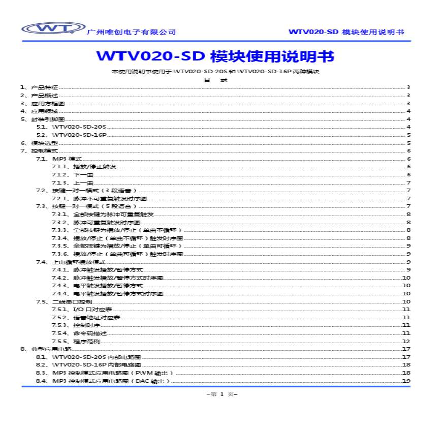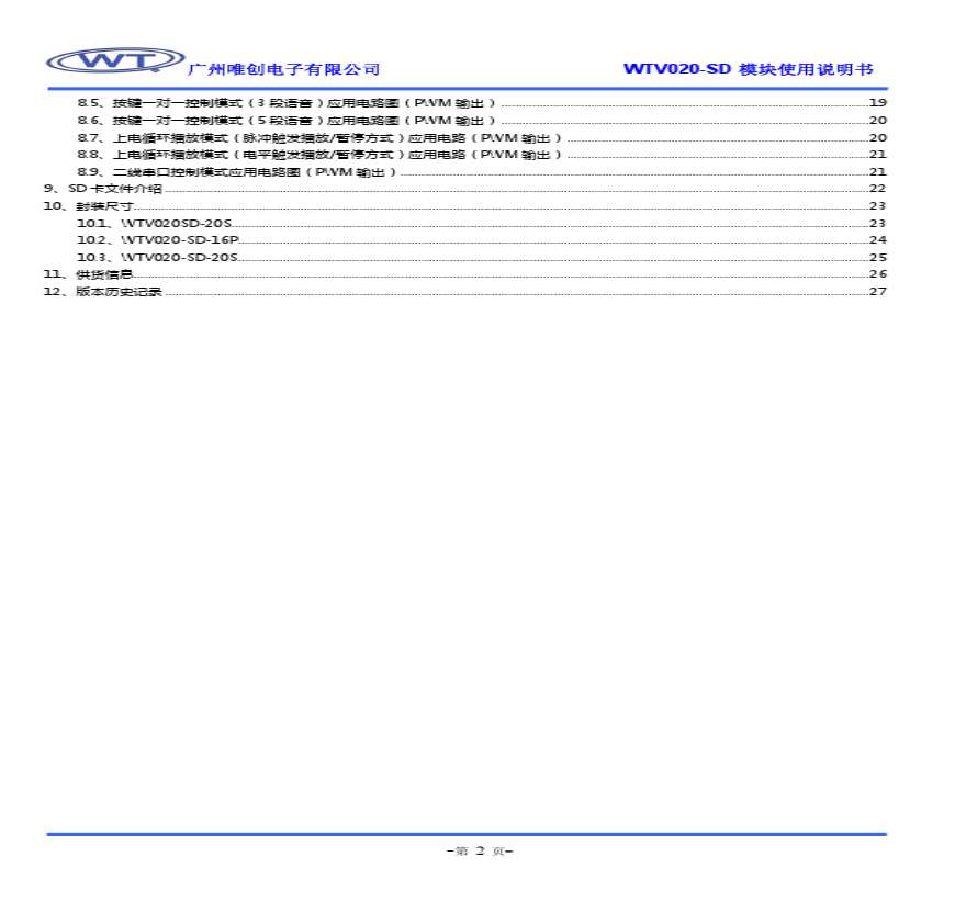 广州唯创电子有限公司广州唯创电子有限公司 WTV 第 WTVP 、WTVS 、供货信息 、版本历史记录 广州唯创电子有限公司 产品支持 页第SD — 学习资料页 本使用于WTVS和WTVP两种模块目录 、产品特征 、产品概述 、应用方框图 、应用领域 、封装引 操作 SD模块使用说明书本使用说明书使用于WTVS和WTVP两种模块目录、产品特征 。