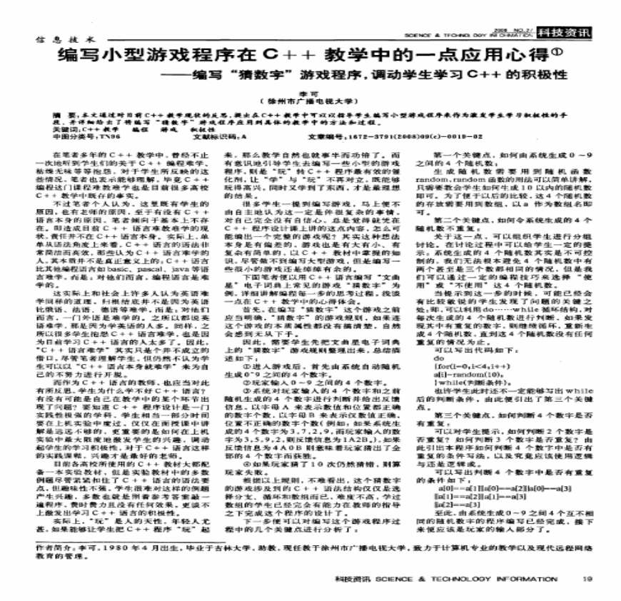 编写小型游戏程序在C++教学中的一点应用心得——编写猜数字游戏程序,调动学生学习C++资料下载,喜欢的朋友可以下载收藏!