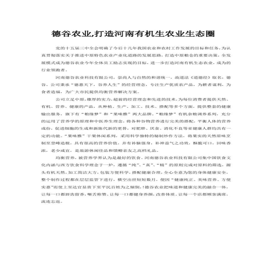 打造河南有机生农业生态圈党的十五届三中全会明确了今后十几年我国农业和农村工作发展的目标和任务,为认真 学习资料页 行业资料农林牧渔 德谷农业,打造河南有机生农业生态圈 文档简介 文档留言 暂无留言信息 文档上传人: 上传日期: