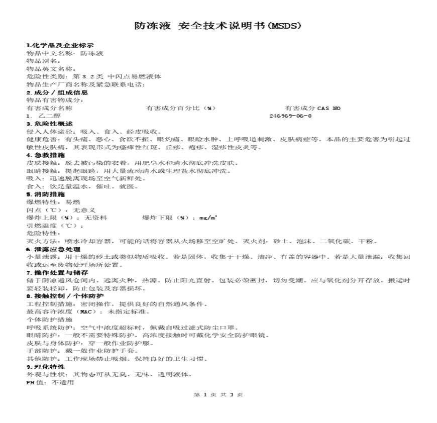 防冻液 安全技术说明书(MSDS)资料下载,喜欢的朋友可以下载收藏!