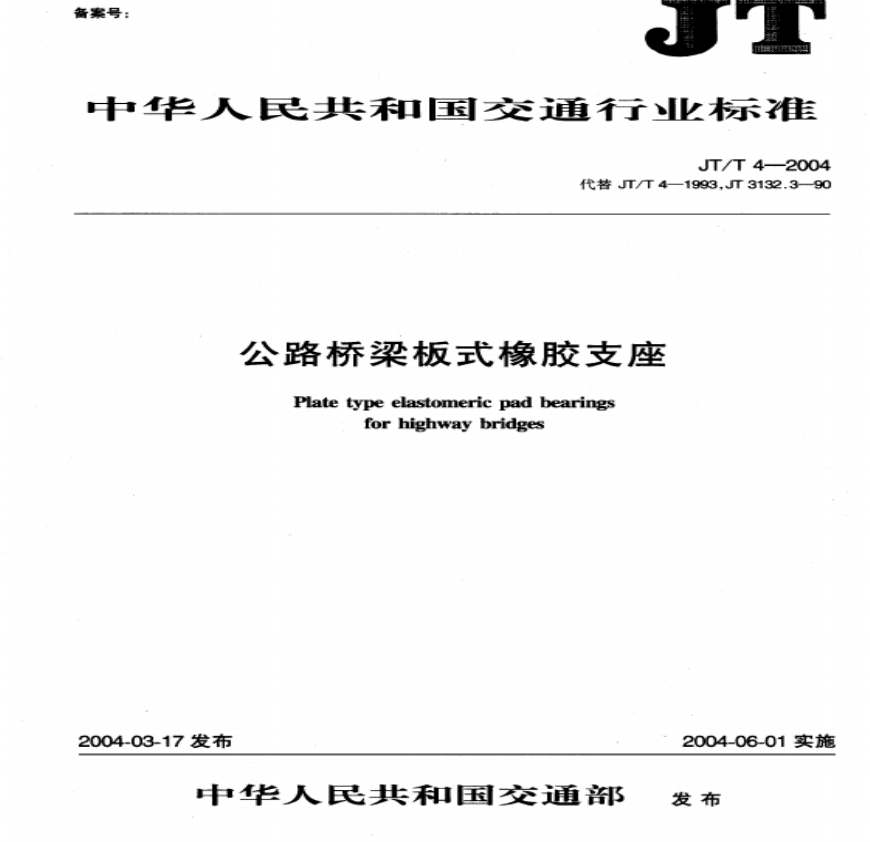 公路桥梁板式橡胶支座(JT T4-2004)资料下载,喜欢的朋友可以下载收藏!