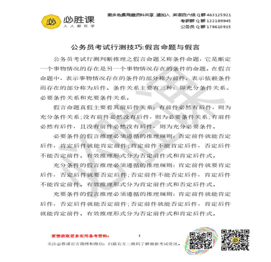 公务员考试行测技巧 假言命题与假言资料下载,喜欢的朋友可以下载收藏!