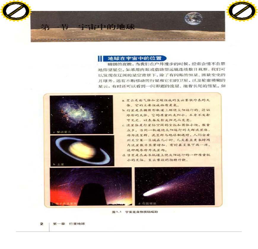 声明:我们收集的教材来源于 学习资料页 高中地理必修一考点复习第一章行星地球第一节宇宙中地球一、地球在宇宙中的位置天体是宇宙间物质存在的形式,如恒星、行星、卫星、星云、流星、彗星。