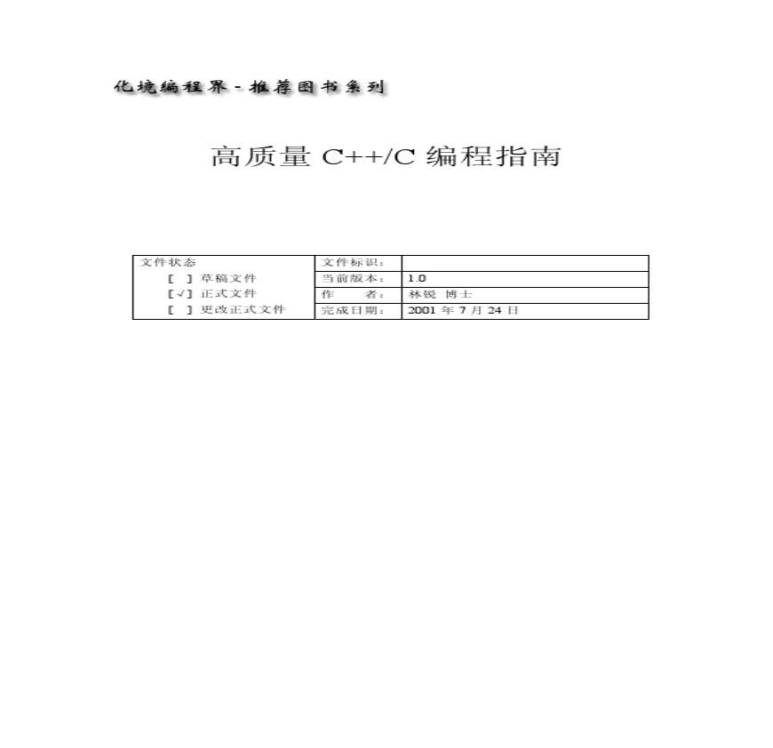 C++ 文件状态 [ [ ]草稿文件 ]更改正式文件 [ √ ]正式文件 文件标识:当前版本:作者:完成日期: 林锐博士 年 月 日 ++C 学习资料 ++文件状态文件标识:草稿文件当前版本:[√]正式文件作者:林锐博士更改正式文件完成日期:年月日高质量C++,版本历史版本 (精品) 学习资料 ++文件标识:当前版本:作者:林锐博士文件状态草稿文件[√]正式文件更改正式文件完成日期:年月日高质量C++,P学习资料 ++文件标识:当前版本:作者:林锐博士完成日期:年月日文件状态草稿文件[√]正式文件更改正式文件高质量C++,P