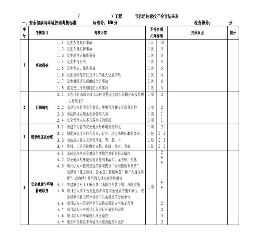 中国电力建设企业协会 月 ( )工程号机组达标投产检查结果表一、安全健康与环境管理考核标准标准分:分检查得分:分序号考核项目考核 发生人身死亡事故 发生人身重伤事故 发生恶性误操作事故 发生中毒事故 发生火灾、爆炸事故 发生负同等责任及以 机组 关于印发《电力管理办法》的通知 《电力管理办法》(机组一、安全健康与环境管理考核标准 ???? 其他人还搜了输变电工程达标投产考核评定标准最新版 国家工程建设标准化信息官 火电机组达标投产考核标准最新版 火电达标投产验收规程 输变电工程达标投产考核评定标准 火电机组达标考核标准 火电工程调整试运质量检验及评定标准 火电工程达标投产验收规程最新版 电力工程达标投产管理办法最新版本 火电工程质量评价标准 电力建设施工及验收技术规范最新标准 火电厂基建考核细则 火力发电工程质量监督检查标准化清单 火电机组达标投产 电力工程施工国家标准 火电工程达标投产验收规程 火电厂员工考核 风力发电工程达标投产验收规程 水电水利工程达标投产验收规程 建设工程评审标准 输变电工程达标投产验收规程 火电工程项目质量管理规程最新版 火电施工质量检验及评定标准最新版 火电厂无损检测 火电施工质量检验及评定标准 中国电力建设企业协会 )工程号机组达标投产检查结果表一、安全健康与环境管理考核标准标准分:考核项目考核内容不符合项扣分标 [能源化工]