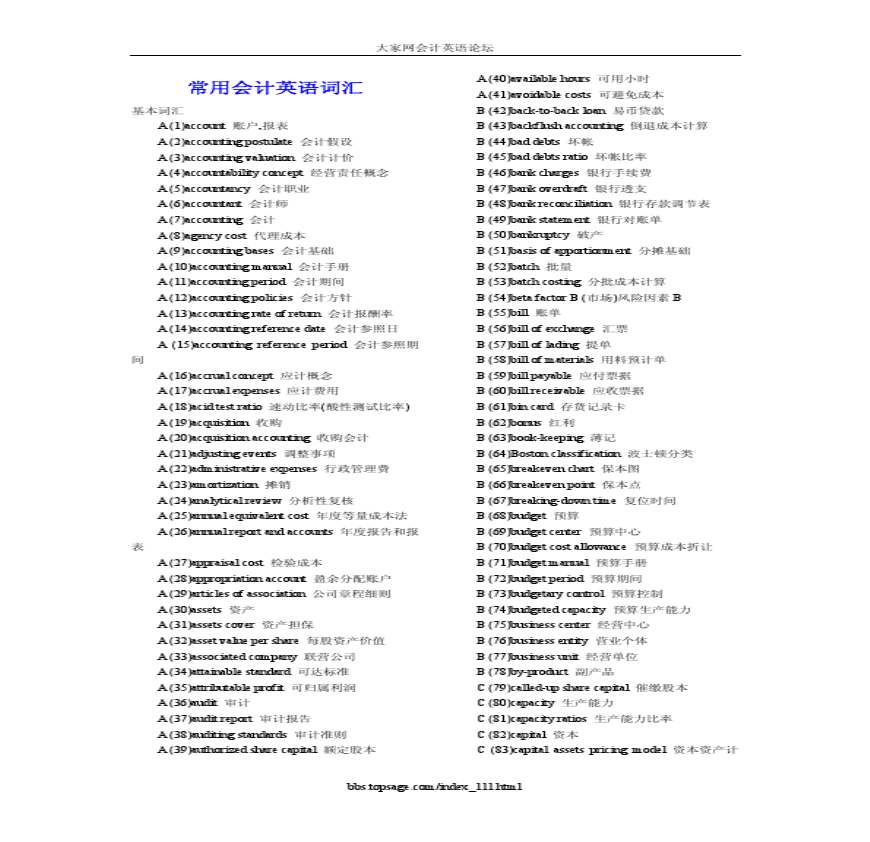 下载_文档下载大家会计英语论坛常用会计英语词汇基本词汇A账户报表A会计假设A会计计价Ab 学习资料页 格式:PDF 页数: 上传日期: :: 用稻壳阅读器打开 道经管之家(原人大 ,常用会计英语词汇页,经管之家(原人大经济论坛) 人大经济论坛? 论坛? 会计与财务管理 学习资料页 大家论坛 常用 基本词汇 A () 账户,报表 A () 会计假设 A () 人大经济论坛 r () 人大经济论坛 r 。