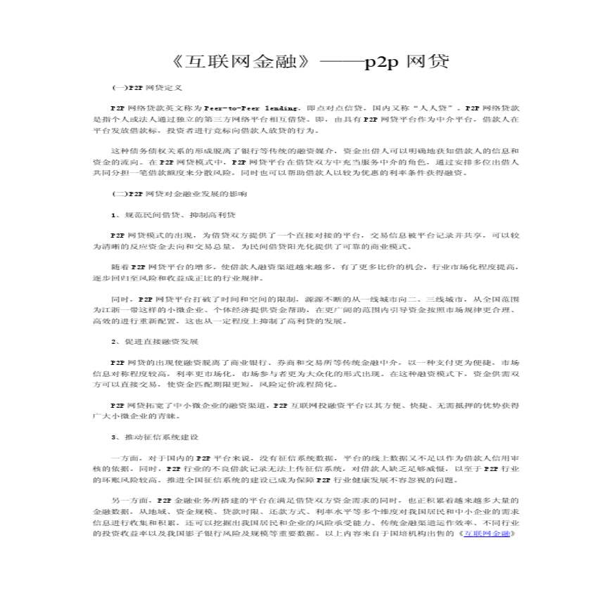 指不同的络节点之间的小额借贷交易,需要借助电子商务专业络平台帮助借贷双方确立借贷关系并完成相关交易手续。