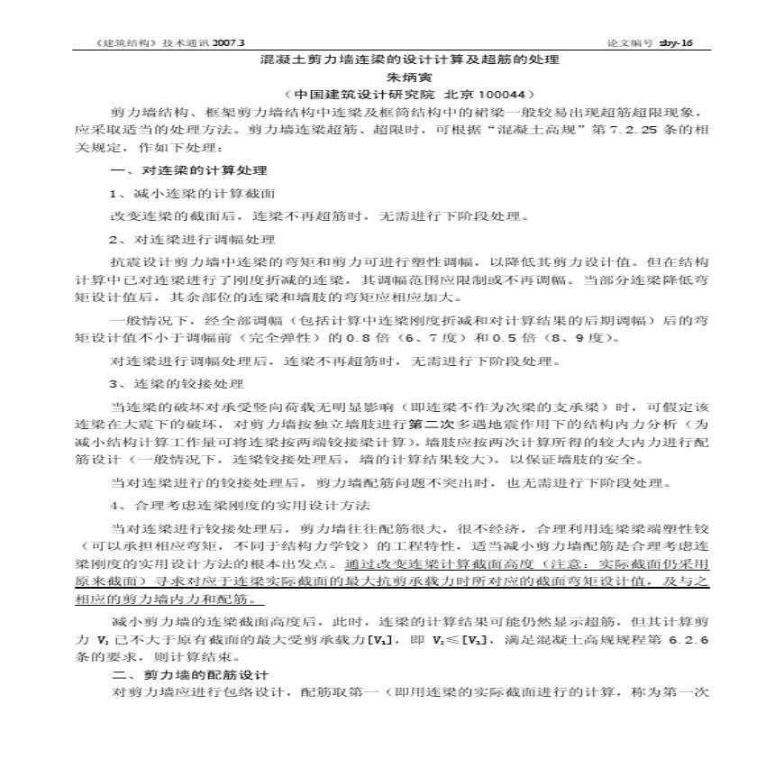 > 溷凝土剪力墙连梁的设计计算及超筋的处理朱炳炎