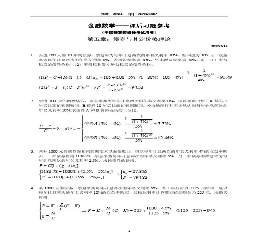 元 人大参考参考和勘误表(月日修订)利息的度量由)月的贴 学习资料页 篇一: 利息理论 复购买一张 年期,面值为 元的国库券,每年末按息票率为 支付利息,第三年末除支付 元利息外同时偿 学习资料页 ,孟生旺编著,中国人民大版,孟生旺编著,中国人民大版,参考和勘误表,年月日修订,第第章章利息的度量利息的度量,由,得,故,在 学习资料页 第一章 设总量函数为A 试计算累积函数 和第 个时段的利息 I 解: 把 代入得A 于是: A A I 学习资料页 ,孟生旺编著,中国人民大版,孟生旺编著,中国人民大版,参考和勘误表,年月日修订,第第章章利息的度量利息的度量,由,得,故,在