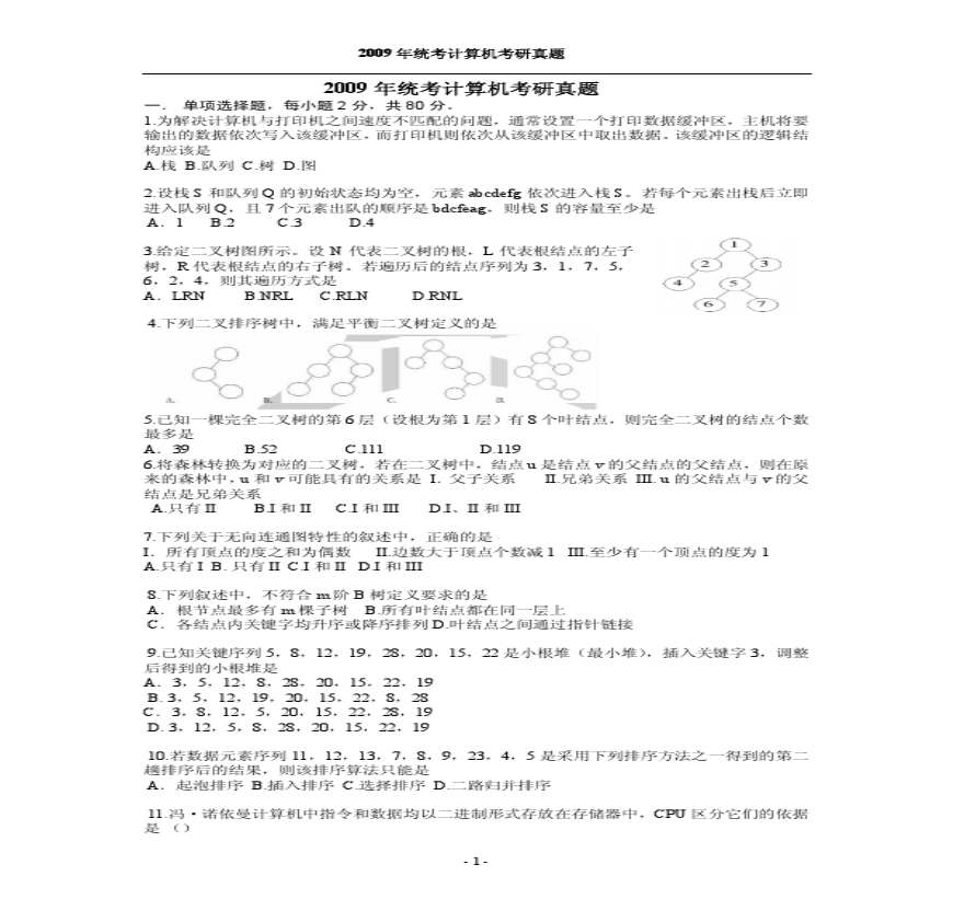 2009年全国硕士研究生入学考试计算机统考真题参考