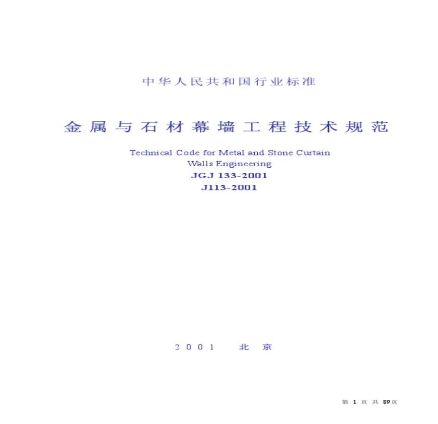 金属与石材幕墙工程技术规范【JGJ133-2001】资料下载,喜欢的朋友可以下载收藏!