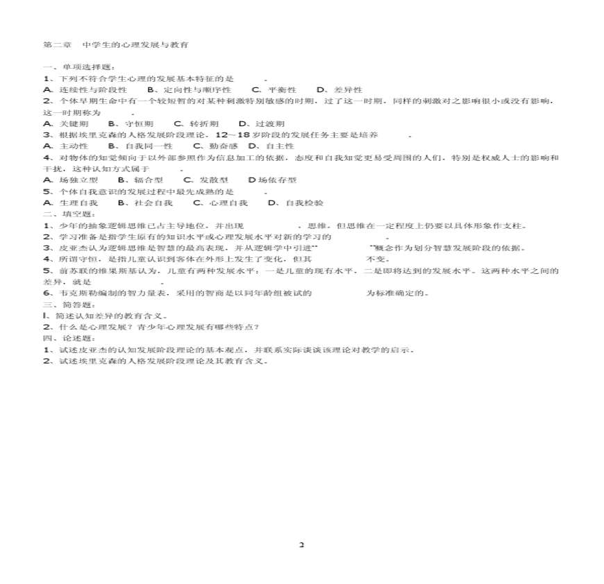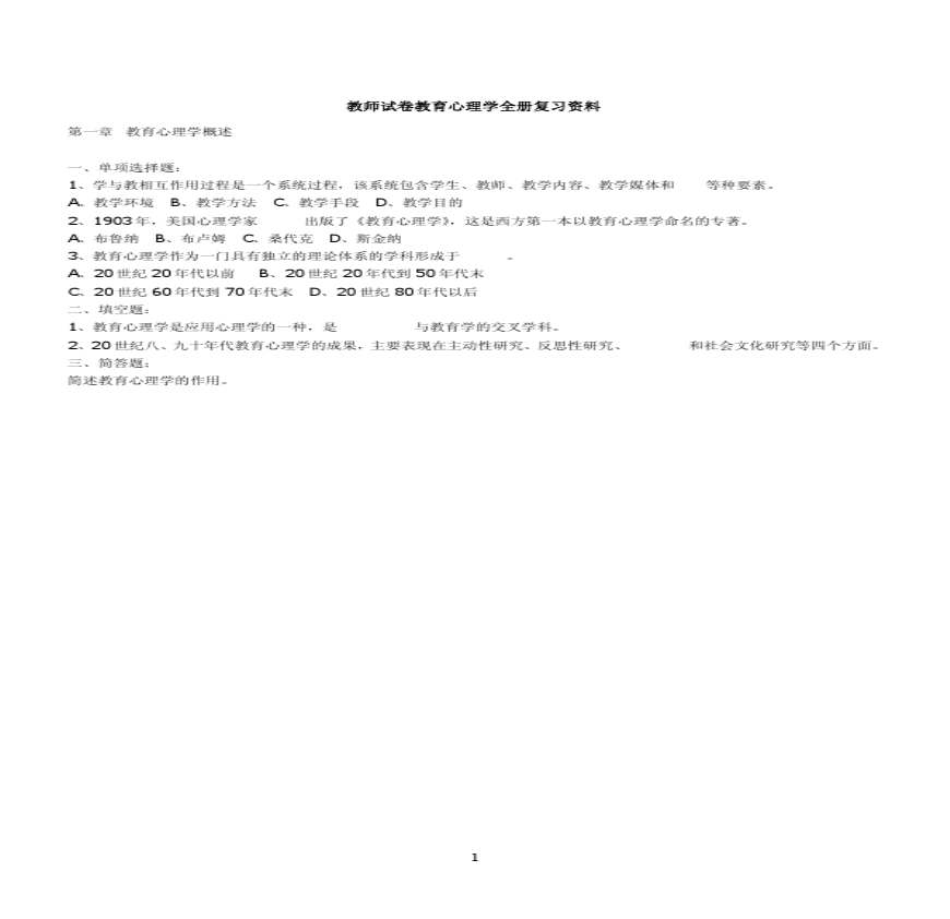 试卷教育心理学概述一、单项选择题: 、学与教相互作用过程是一个系统过程,该系 学习资料页 试卷任师越困师,最佳激起水平越低。
