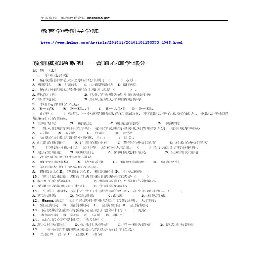 酷考教育学考研-预测模拟题系列-----普通心理学资料下载,喜欢的朋友可以下载收藏!