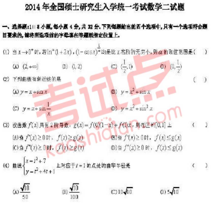 > 考试点最新版 2014年考研数学二真题