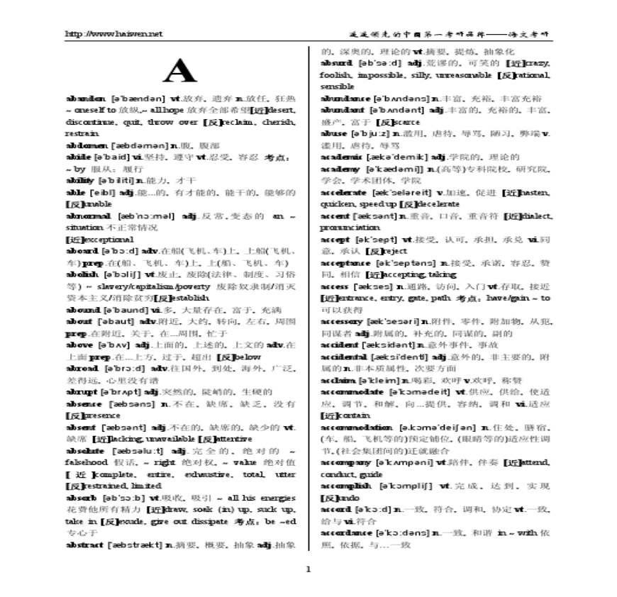 xb其他人还搜了考研英语词汇表 考研英语基础词汇 考研英语二词汇电子版 考研英语复习资料 考研英语一词汇电子版 考研英语词汇电子版 考研英语基础词汇 考研重点英语词汇 考研英语买什么资料比较好 零基础英语考研需要学多久 考研英语基础词汇 考研英语高频词汇汇总 考研英语核心词汇 考研英语词汇大全 考研英语语法大全 考研英语大纲词汇表 考研英语二核心词汇 考研英语材料 考研英语辅导资料推荐 考研英语词汇 考研英语词汇表下载 考研英语高频词汇 考研英语词汇下载 学科英语考研院校汇总 考研英语词汇 列举_单词年月日_ 学习资料页 遥遥领先的中国第一品牌——海文 A b [ EbAE ] 放弃,遗弃 放任,狂热~ 放纵,~ 放弃全部希望[近] r, , 大全 元元 讲义 元