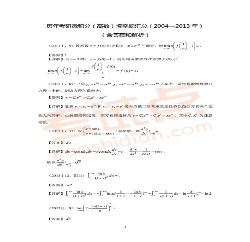 历年考研微(高数)填空题汇总(2004-2013).pdf 免费下载