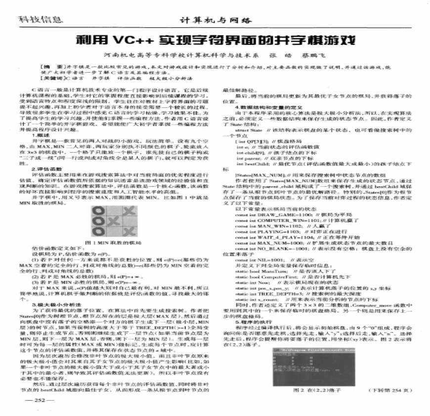 下载_文档下载科技信息计算机与络利用VC实坝字符界面的并字棋游贱河南机电高等专科学校计算机科学与技术系张皓蔡鹏飞[摘要]井字棋是一款比较b