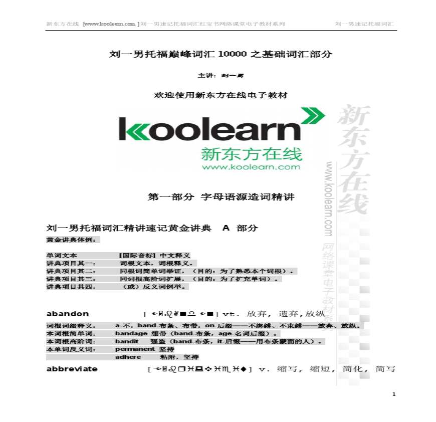 讲义 多多文库 学习资料页 新东方在线 英语络课堂电子教材系列 巅峰 电子讲义主讲:欢迎使用新东方在线电子教材第一集b b 学习资料页 讲义 巅峰 之基础部分 主讲: 第一部分 字母语源造词精讲 精讲速记黄金讲典 A 部分 黄金讲典