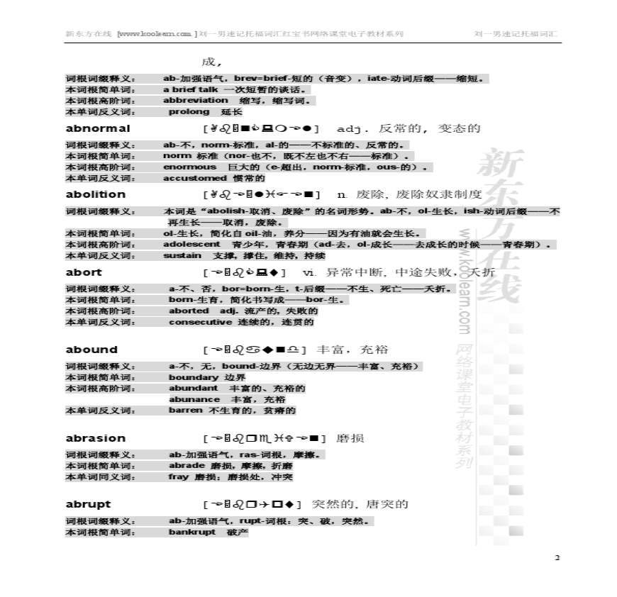 学习资料页 巅峰r文本及MP音频 格式:DOCX 页数:页 上传日期: :: 用稻壳阅读器打开 巅峰(可编辑)下载_ 学习资料 讲义新东方在线速记红宝书络课堂电子教材系列刘一男速记托福巅峰之基础词汇部分主讲:刘一男欢迎 学习资料页 巅峰 之基础部分主讲:第一部分 字母语源造词精讲精讲速记黄金讲典 A 部分黄金讲典体例:单词文