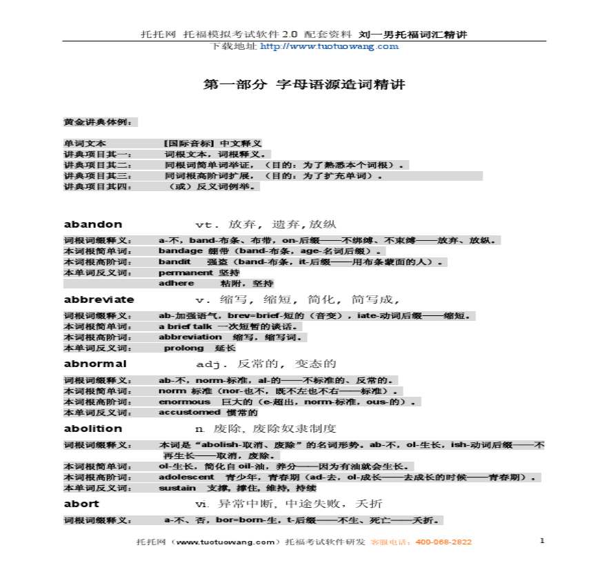 《速记精典》这本书讲解词根什么的跟其他单词书很不一样,很清楚,所以我大力推荐,老师的书,没的说哈!汇总年一线词汇教学心得,倾情奉献词汇名师力作、将 学习资料页 巅峰词汇 之基础词汇部分主讲:第一部分 字母语源造词速记黄金讲典 A 部分黄金讲典体例:单词文